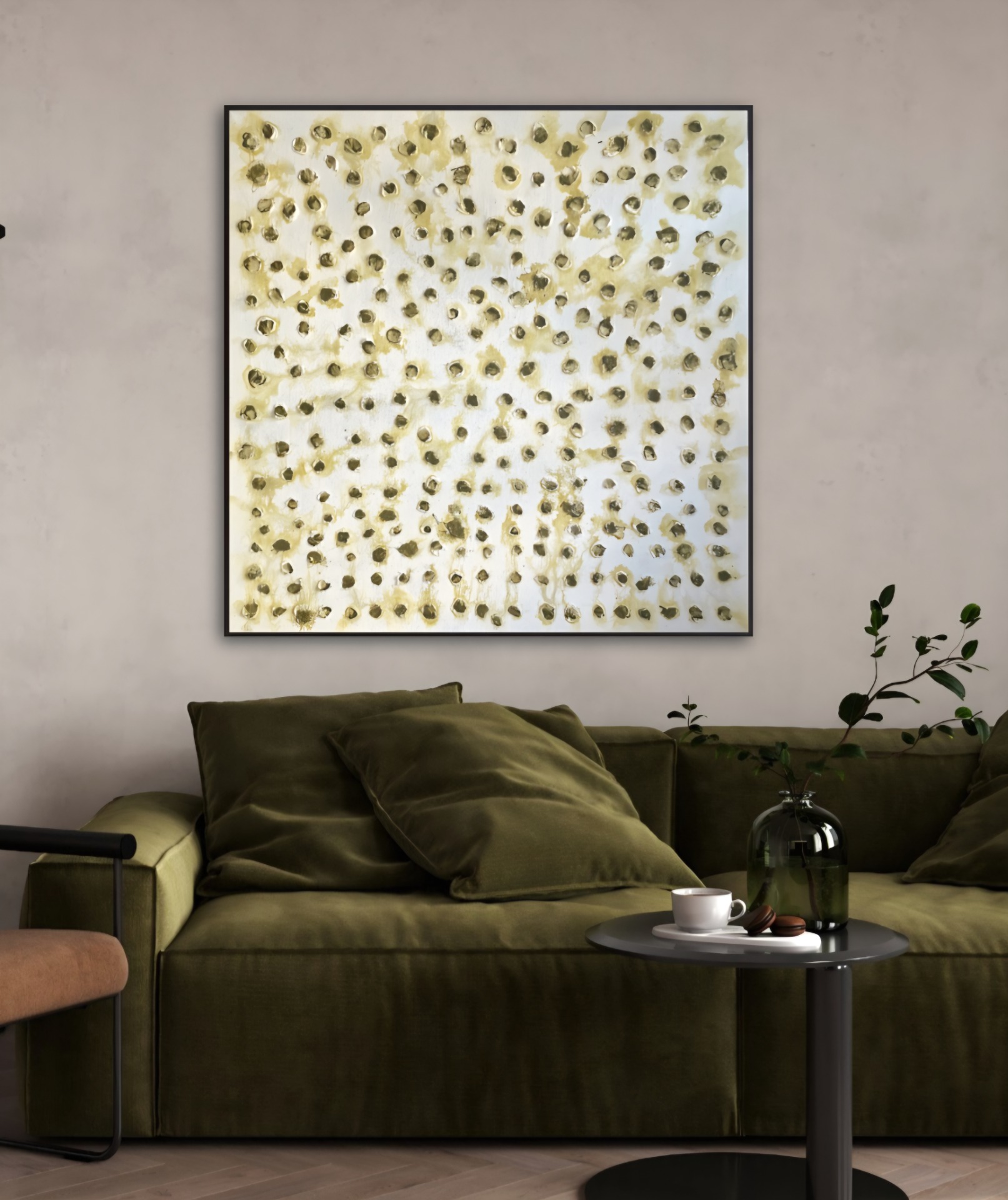 Akryyli/lyöntimetalli kulta pellavakankaalle. Video teoksesta löytyy Facebookista Outi Antila Art