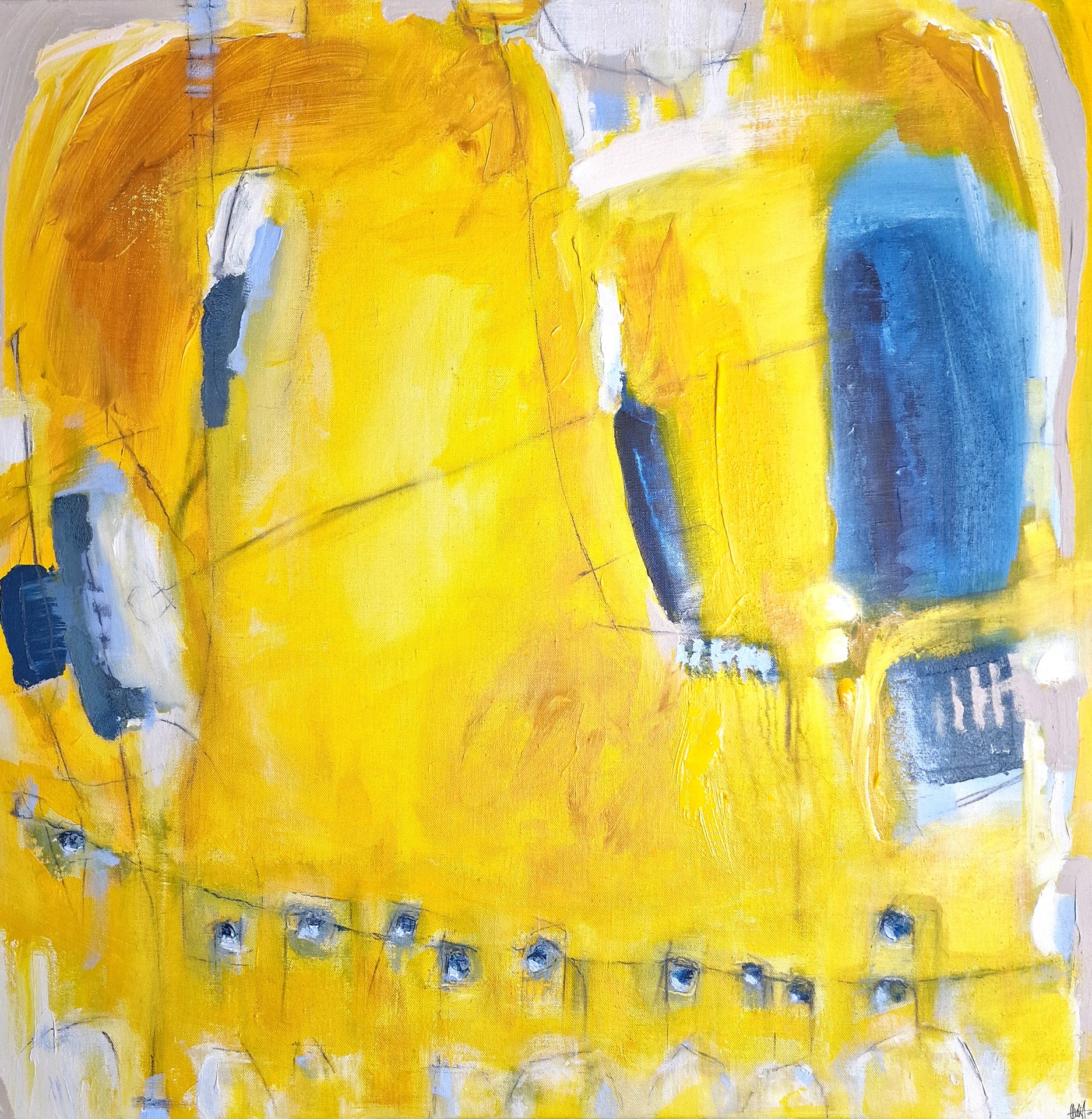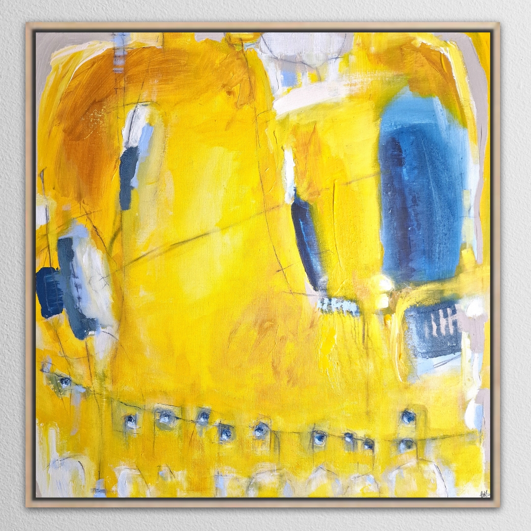 HUHTIKUU 100x100x2cm Akryyli pellavakankaalle. Nähtävillä taidenäyttelyssä Helsinki outletissa 30.4.2026 asti